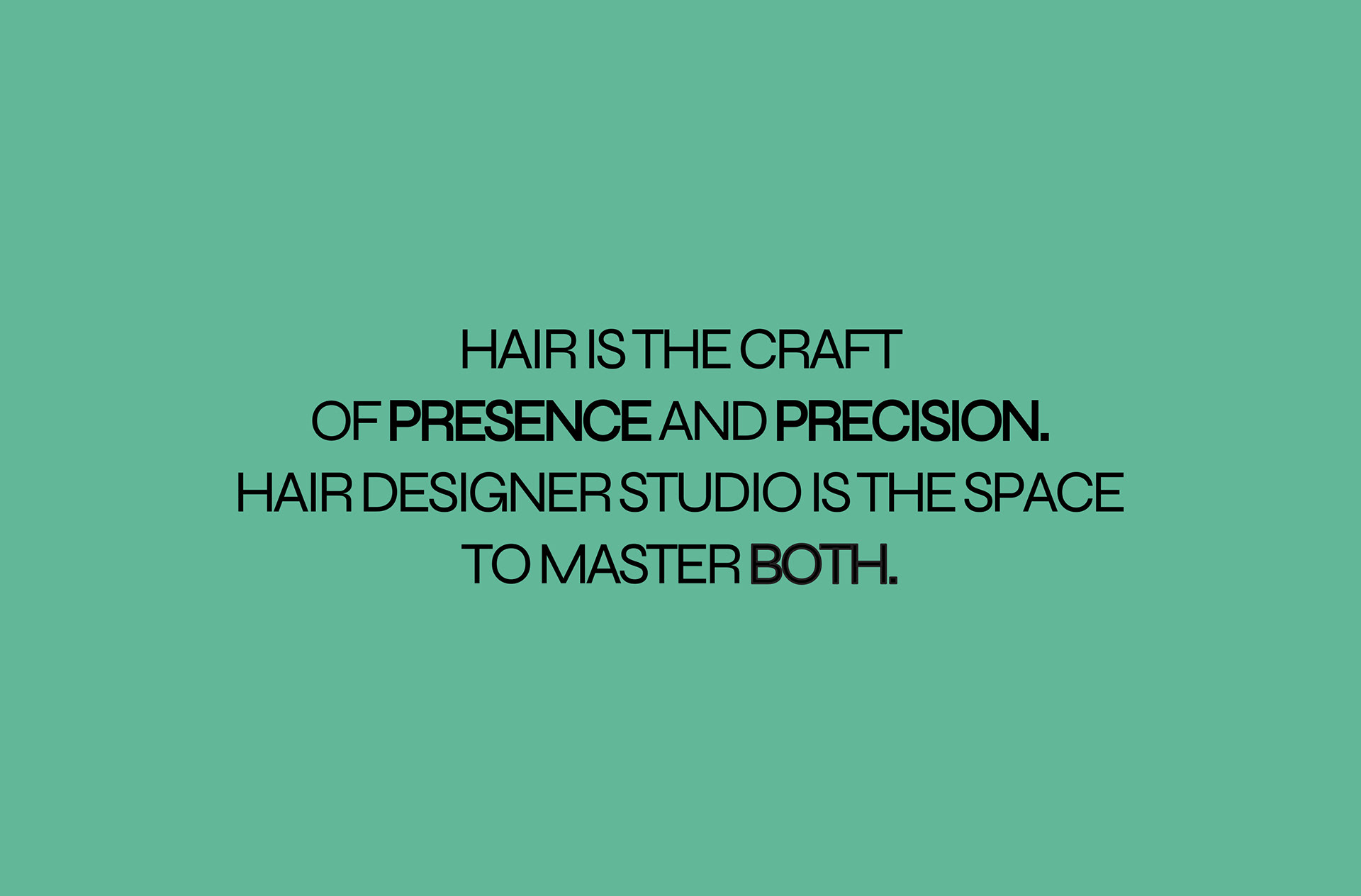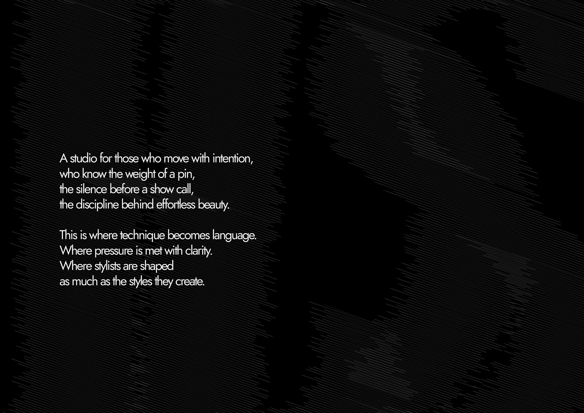 The layout breaks from traditional alignment to create rhythm and tension. Words shift diagonally, play with weight, and stretch into negative space – mirroring the way a stylist works with hair: building form, guiding flow, and commanding attention through deliberate imbalance.